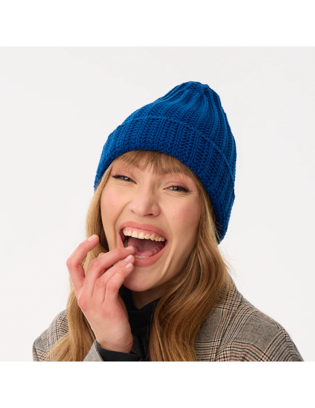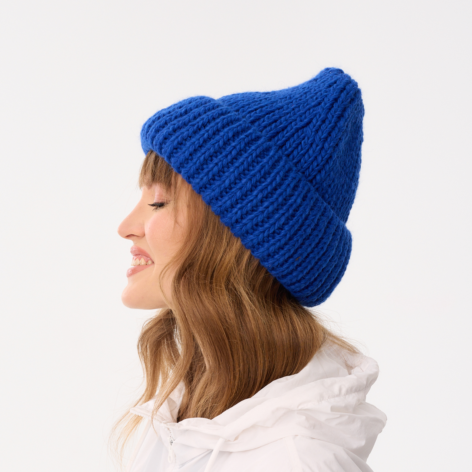 Model zrobiony jest z przędzy z domieszką 10% wełny, a jego kształt oraz struktura grubego splotu wpisują się w najnowsze trendy czapek typu “chunky”.