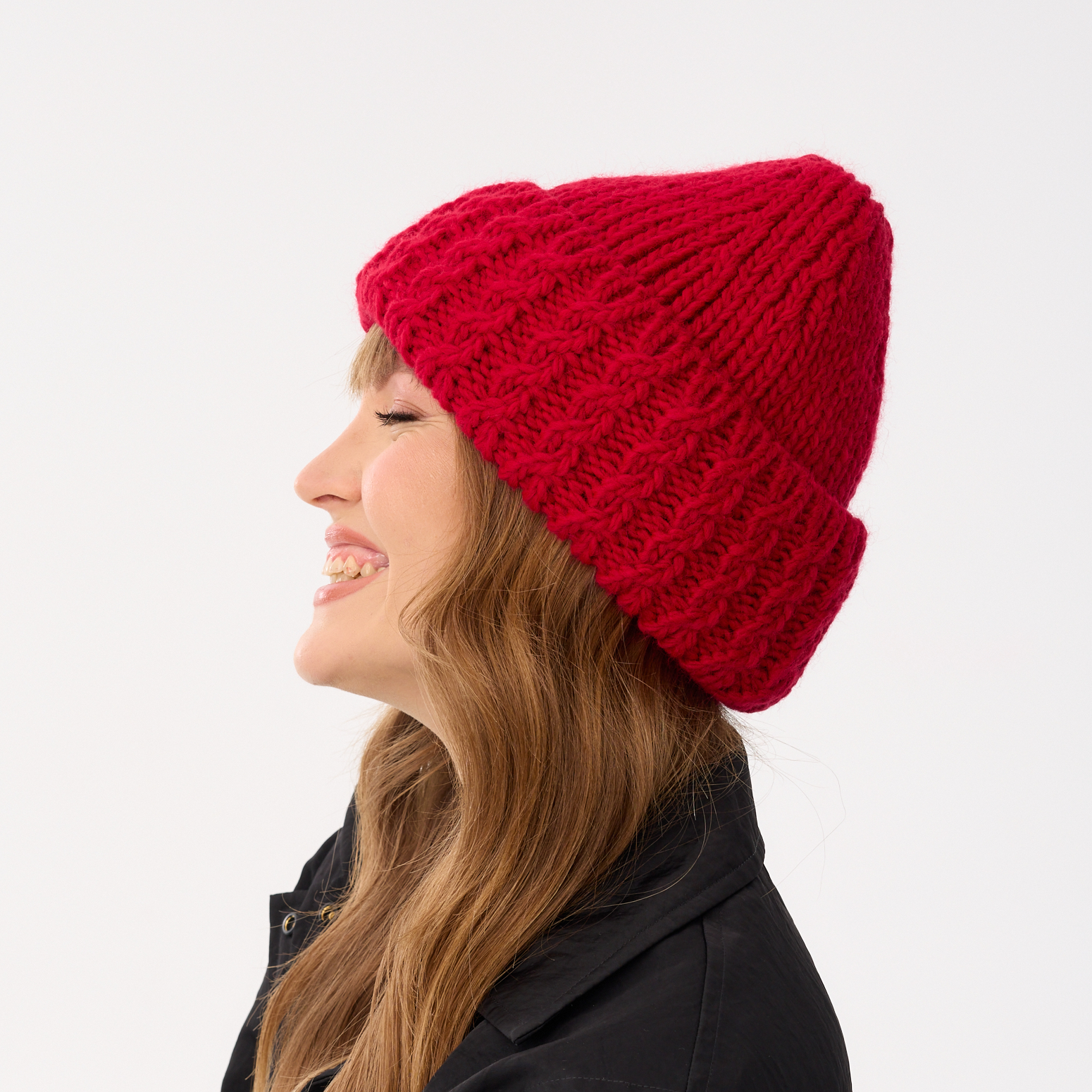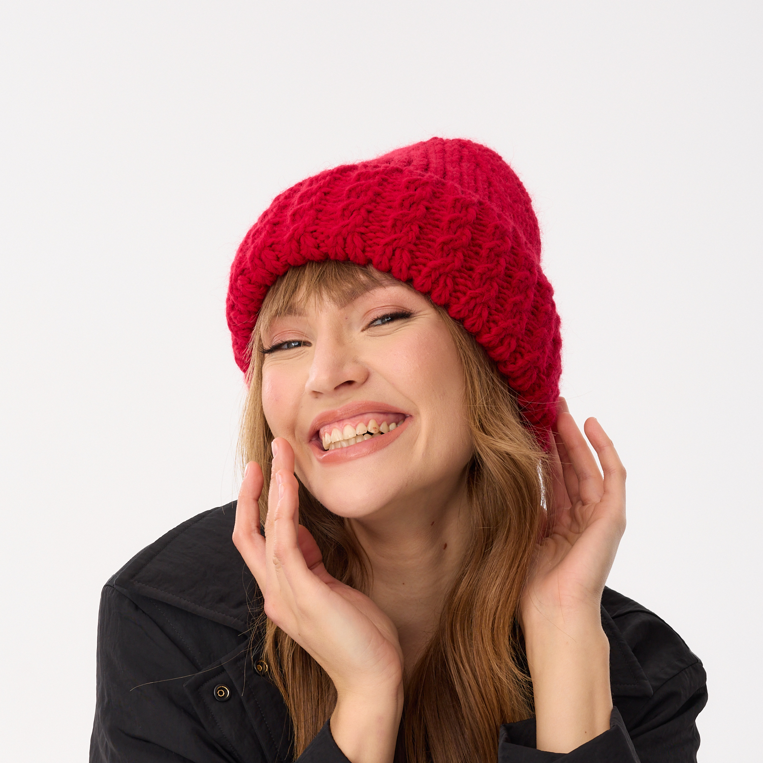 Model zrobiony jest z przędzy z domieszką 10% wełny, a jego kształt oraz struktura grubego splotu wpisują się w najnowsze trendy czapek typu “chunky”. Przepiękny splot na wywinięciu przykuwa wzrok i nadaje projektowi niepowtarzalnego charakteru.